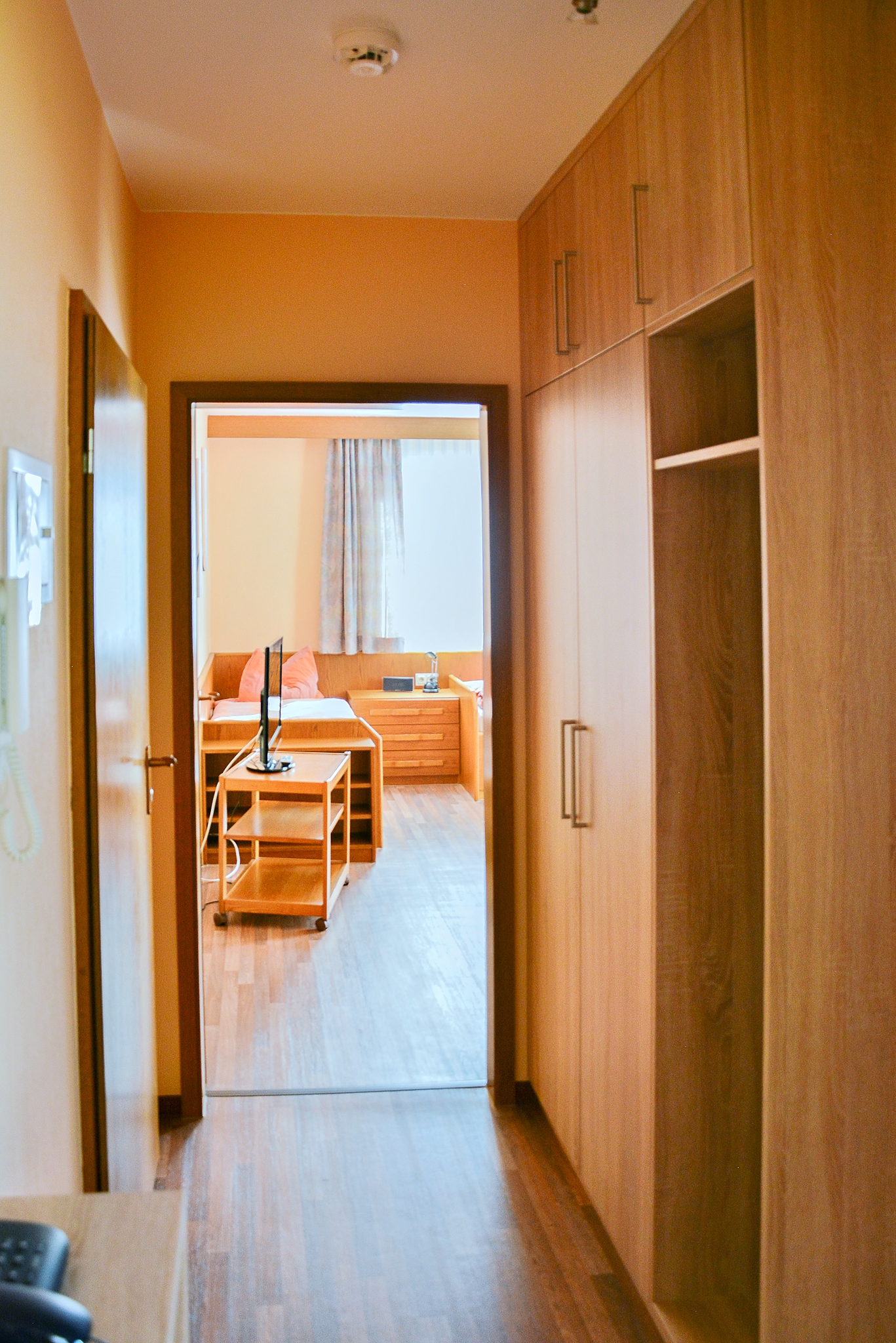 Wohnfläche 20 m², Vorraum, kombiniertes Wohn-/Schlafzimmer, Einbauküche, Dusche und WC.