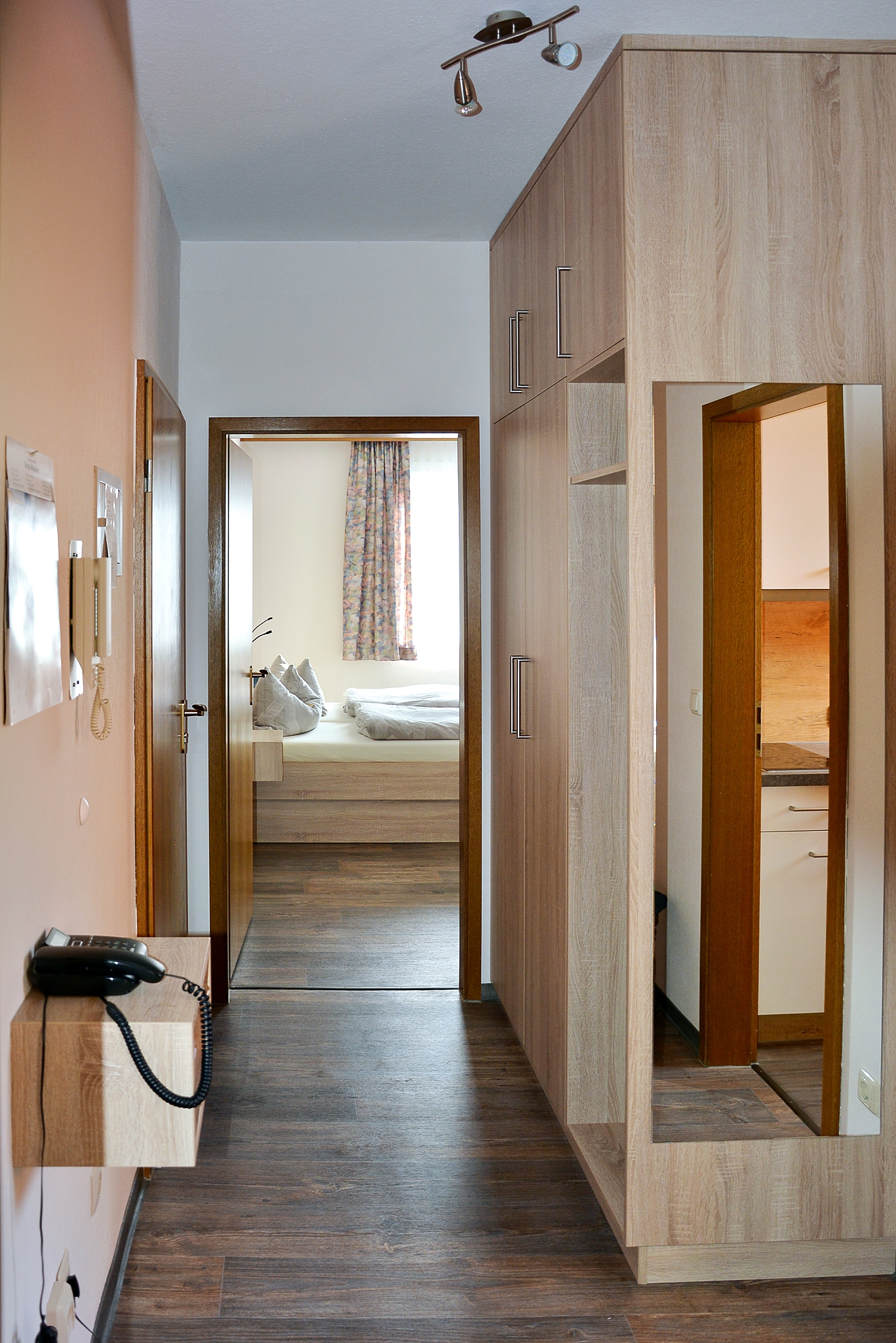 Wohnfläche 48 m², Vorraum, Schlafzimmer für 2 Personen, kleiner Wohn-/Schlafraum für 1 Person, Küche mit Essecke, Bad und WC.