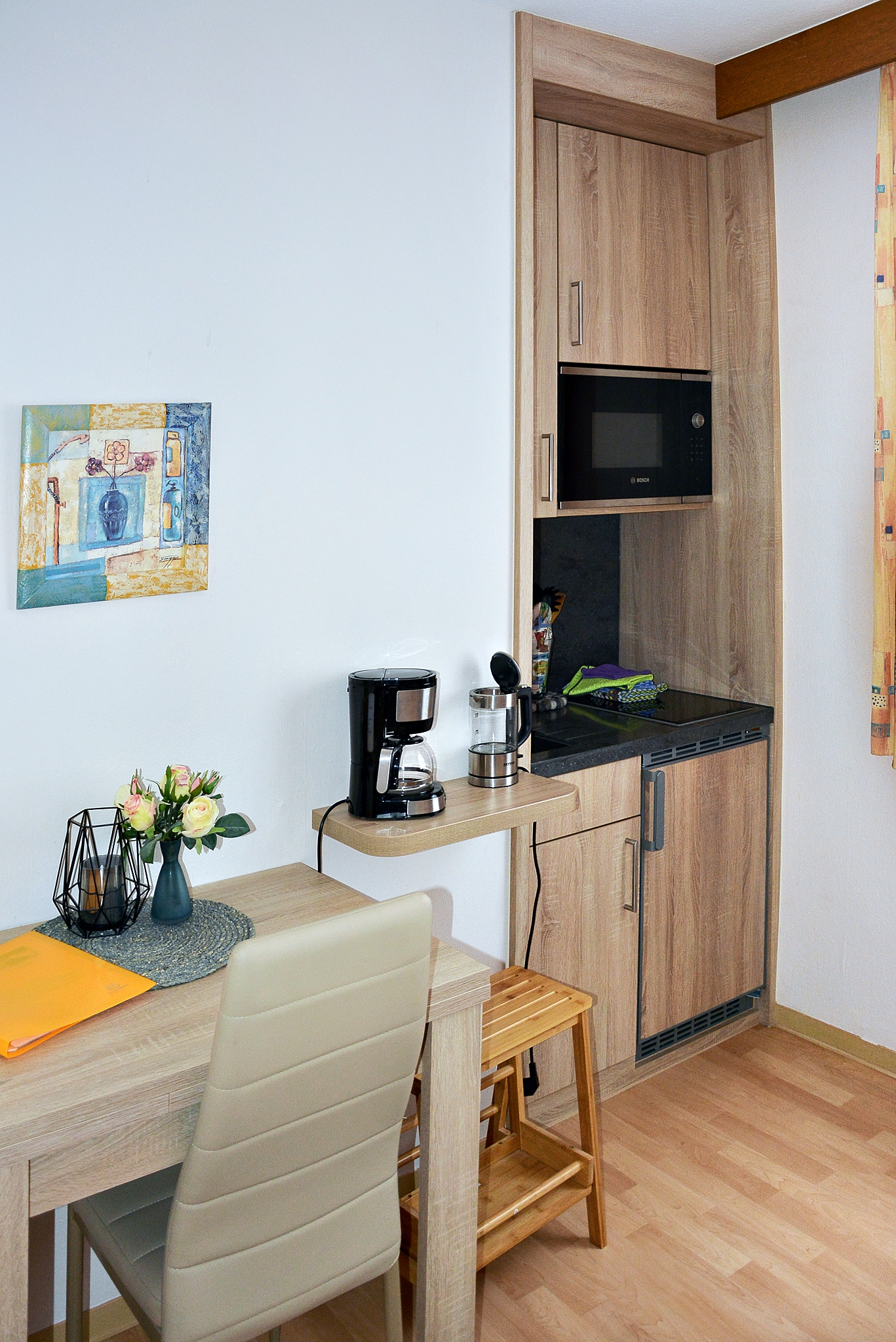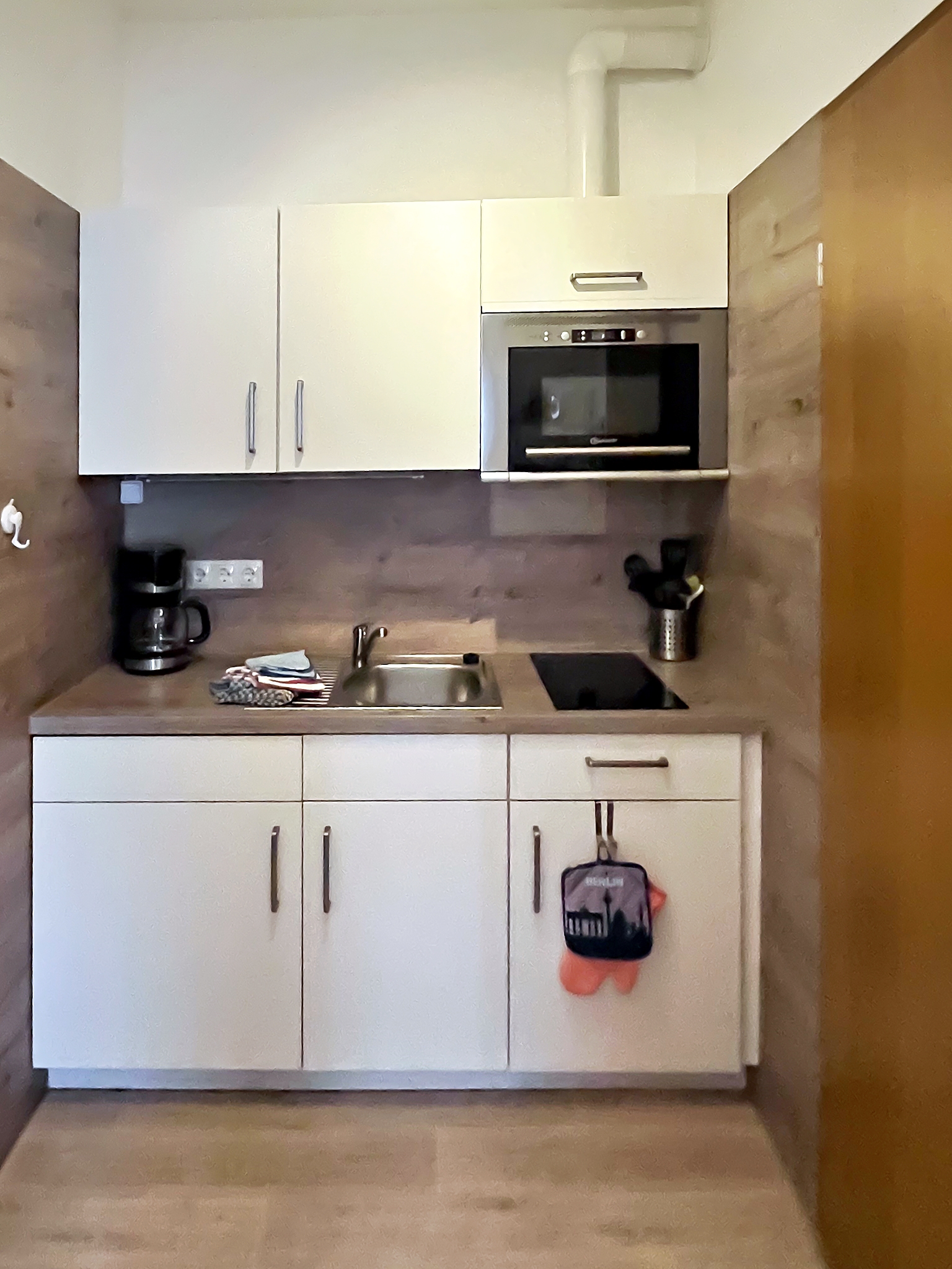 Wohnfläche 30 m², Vorraum, kombiniertes Wohn-/Schlafzimmer, Küche, Kühlschrank, Dusche und WC.